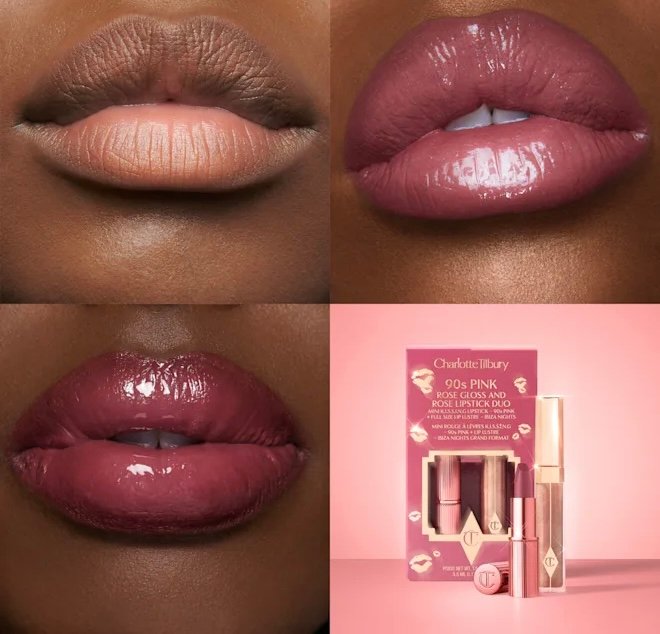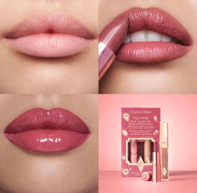 حبيباتي، اكشفن عن سر الشفاه الوردية المتفتحة بلمسة نهائية لامعة براقة أثناء التنقل مع ثنائي أحمر الشفاه الوردي اللامع الجديد! 90s Pink Rose Gloss + Rose Lipstick Duo!"